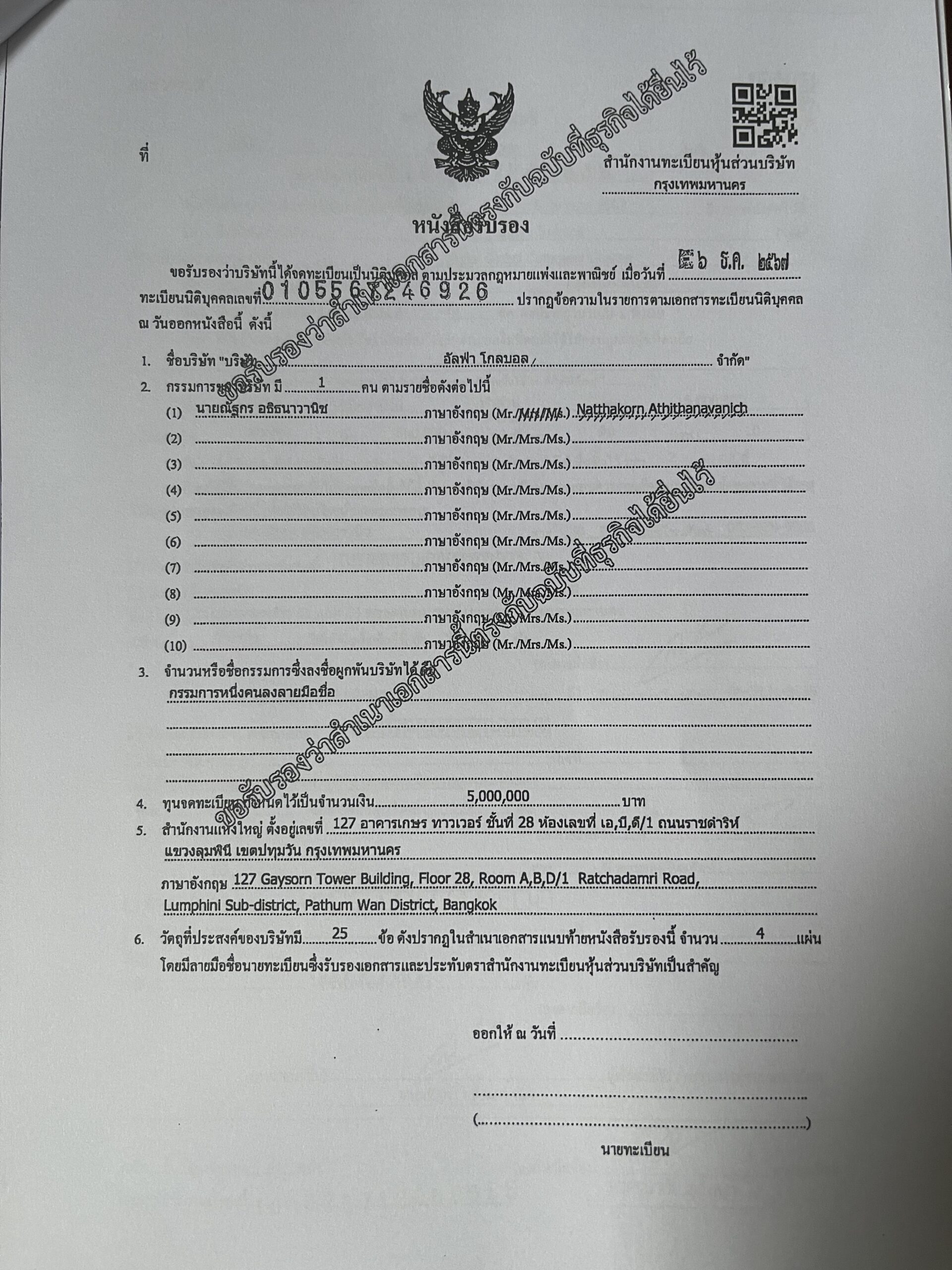 3. จากการคัดเอกสารทางการจากกรมพัฒนาธุรกิจการค้า พบว่าภายในระยะเวลาเพียง 8 เดือน นับตั้งแต่ก่อตั้งบริษัทในเดือนธันวาคม 2567 บริษัท อัลฟา โกลบอล จำกัด แจ้งเปลี่ยนที่ตั้งสำนักงานถึง 2 ครั้ง จากเดิมตั้งอยู่ที่อาคาร เกสร ทาวเวอร์ ชั้น 28 เปลี่ยนเป็น อาคาร วัน แบงค็อก ทาวเวอร์ ชั้น 37 ในวันที่ 24 มีนาคม 2568 และต่อมาในวันที่ 18 กรกฎาคม 2568 แจ้งเปลี่ยนที่อยู่บริษัทอีกครั้งเป็น อาคาร วัน แบงค็อก ทาวเวอร์ ชั้น 17