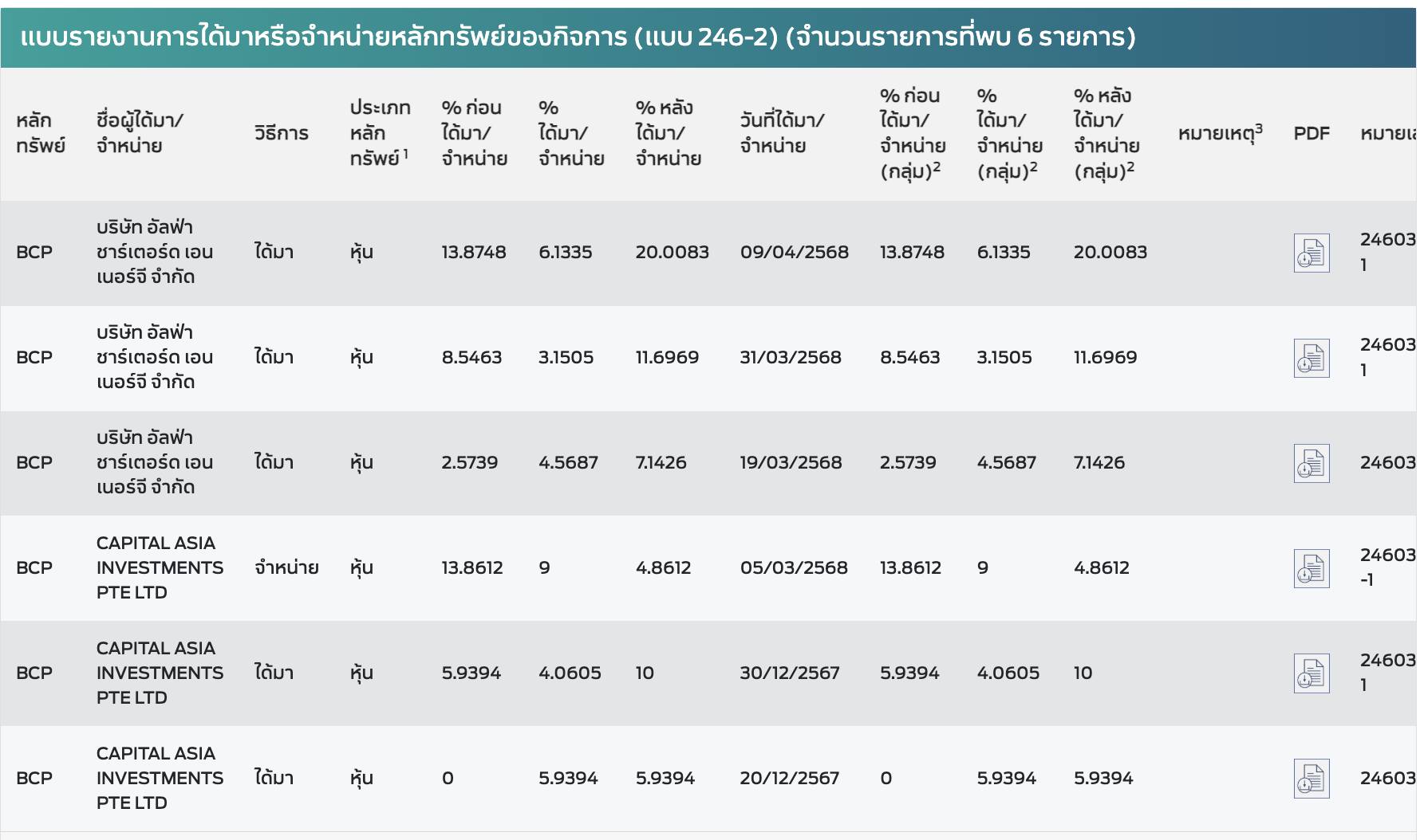 ข้อมูลแบบ 246-2 เกี่ยวกับหุ้น BCP ชี้ชัดว่า บริษัท อัลฟา ชาร์เตอร์ด เอเนอร์ยี จำกัด เพิ่มสัดส่วนการถือหุ้นจาก 2.04% (สัดส่วน ณ วันปิดสมุดทะเบียน 14 มีนาคม 2568 บนเว็บไซต์ตลาดหลักทรัพย์) เป็น 7.14% ในวันที่ 19 มีนาคม 2568 (ห้าวันหลังปิดสมุดทะเบียน) จากนั้นซื้อหุ้นเพิ่มจนแตะสัดส่วน 11.7% ในวันที่ 31 มีนาคม 2568 และเพิ่มเป็น 20% ในที่สุด ในวันที่ 9 เมษายน 2568 และเมื่อดูรายงานการซื้อขายหุ้น BCP ทุกๆ 5% ระหว่างเดือนธันวาคม 2567 และเมษายน 2568 (แบบ 246-2) จะเห็นว่ามีแต่ธุรกรรมจากบริษัท อัลฟา ชาร์เตอร์ด เอเนอร์ยี และ Capital Asia Investments (CAI) เท่านั้น (ดูภาพด้านล่าง)