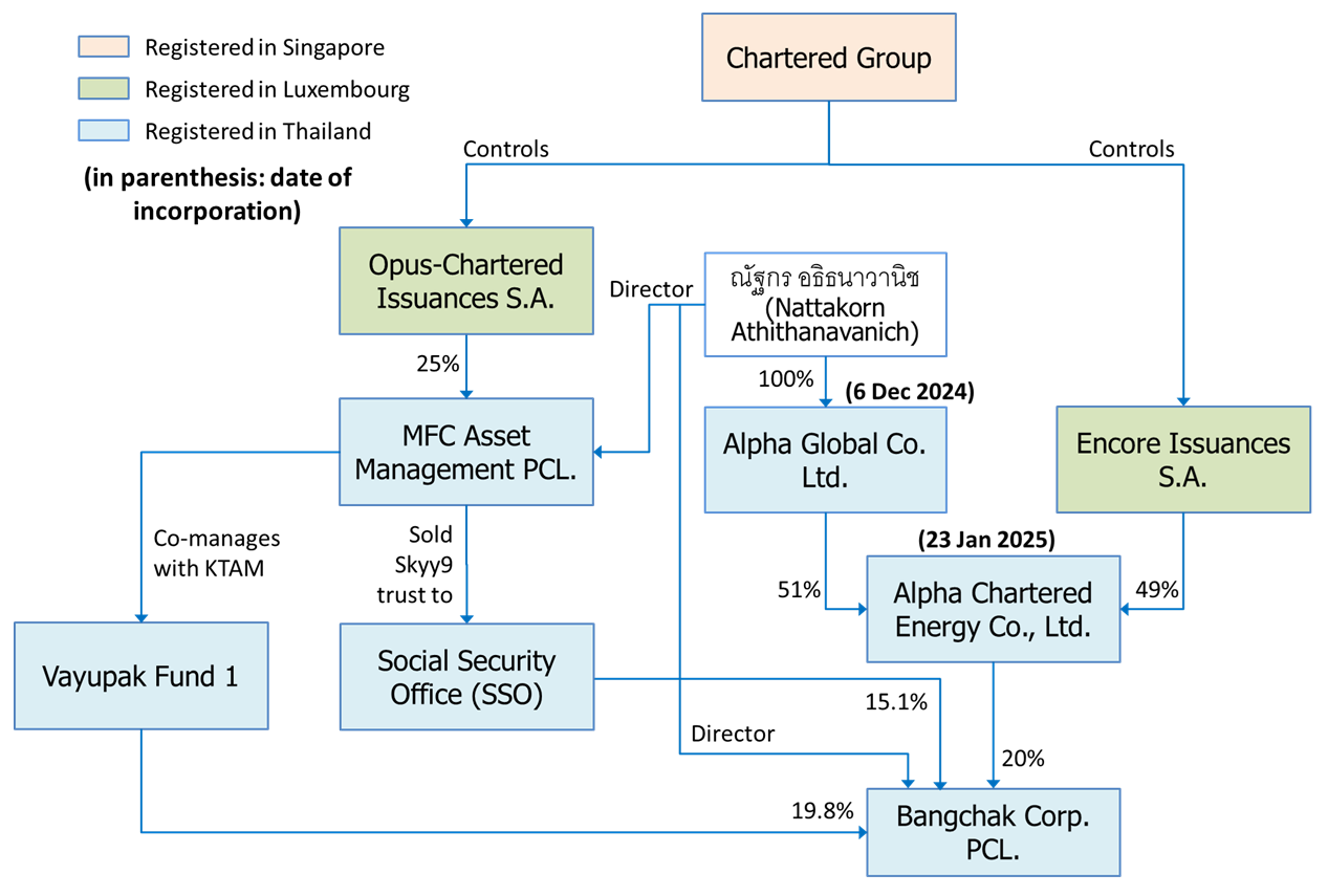 อนึ่ง ในผังนี้ผู้เขียนรวม บมจ. บลจ. เอ็มเอฟซี บริษัทจัดการกองทุนชื่อดังด้วย เนื่องจากวันนี้ผู้ถือหุ้นรายใหญ่สุดของบริษัทคือ Opus-Chartered Issuances S.A. จดทะเบียนลักเซมเบิร์ก ซึ่ง บลจ. เอ็มเอฟซี เปิดเผยเองกับสื่อในเดือนกันยายน 2567 ว่า เป็นการเข้าลงทุนของ Chartered Group ซึ่งเป็นกลุ่มเดียวกับที่เข้ามาลงทุนใน บมจ. บางจาก
